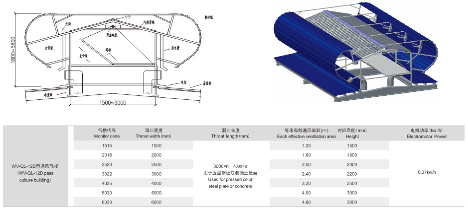 特点: 1、圆弧形外观,美观大方,结构坚固合理; 2、侧面圆弧形,有效的减少风压阻力,抗风性好; 3、内部空间大,容量高,通风效果好; 4、结构紧凑,防水效果好; 5、设有天沟和落水管,能杜绝飘雨现象; 6、设有辅助风机,能提高通风效率; 7、底部设置阀板,可自由控制通风; 8、适用于各种车间、厂房、仓库等对通风量要求较大的公共建筑。 |